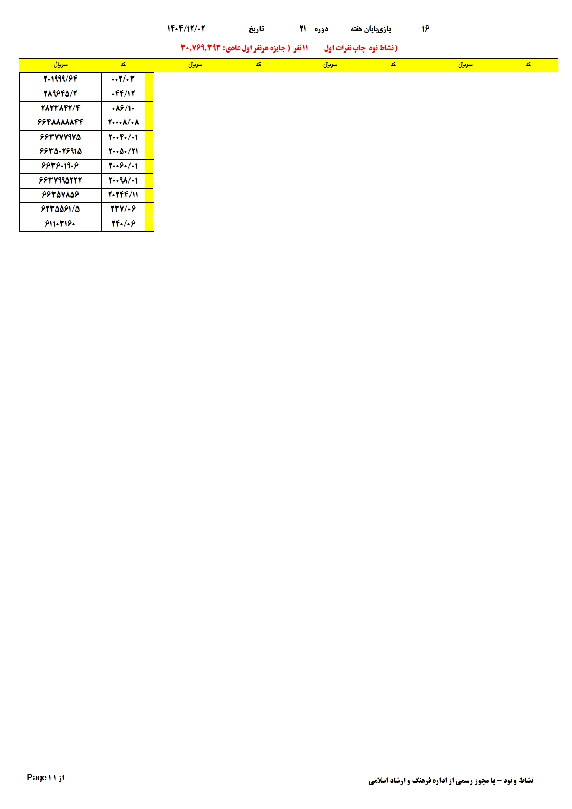 قابل توجه نمایندگان عزیز آخرین مهلت ارسال فایل 16 تایی شماره 21 تا ساعت 45:16 روز شنبه 02 با سپاس فراوان از همکاری شما آلبوم دیجیتال مسابقه دوره 21 تعداد کل شرکت کنندگان 18655 جمع کل فروش 583.577.462 لینک دانلود آلبوم دیجیتال مسابقه لیست برگشتی جهت دریافت لیست پی دی اف از امکانات آلبوم تعداد بازیهای انجام شده: 16 بازی |