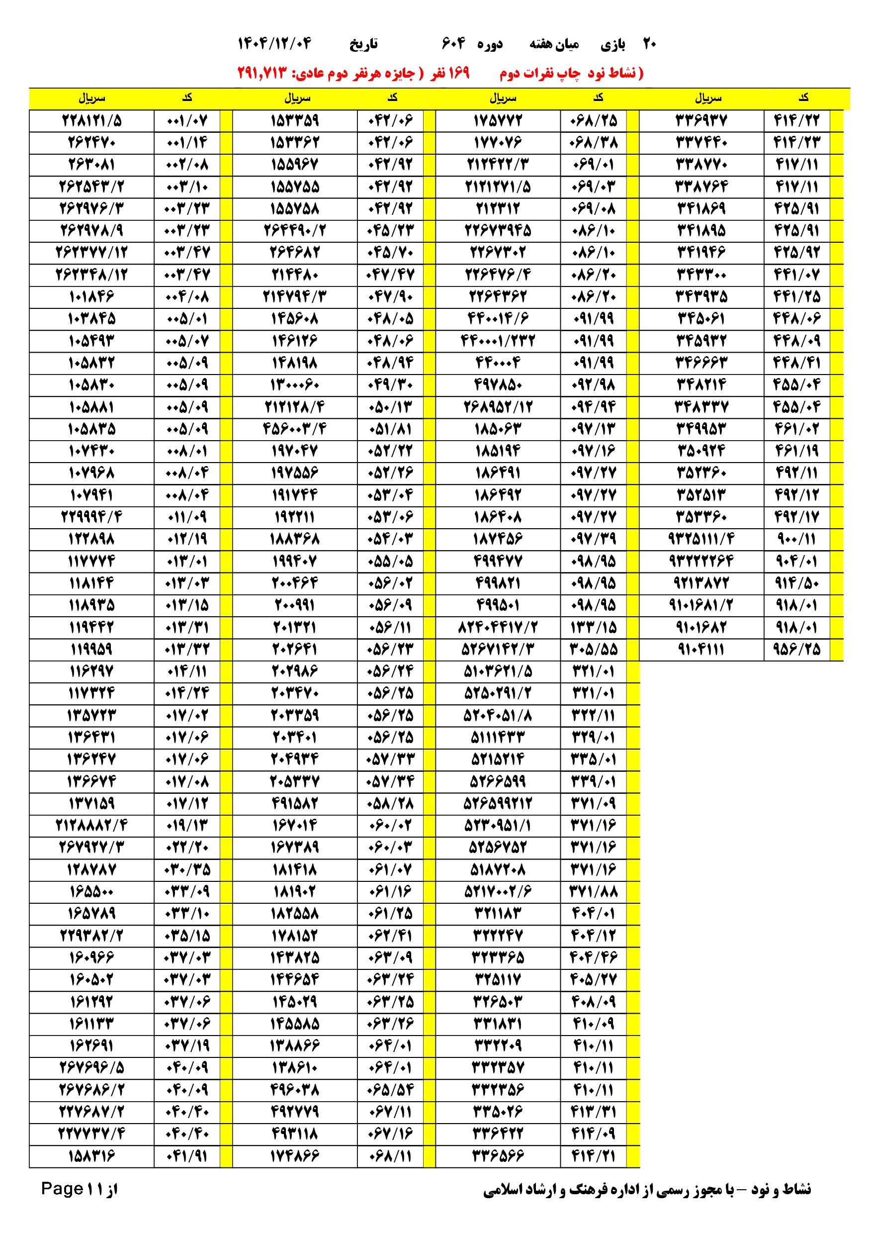 | تعدادبرگه های یک خطا | 169 | مبلغ.هدیه.نفرات.دوم | 291.713 |