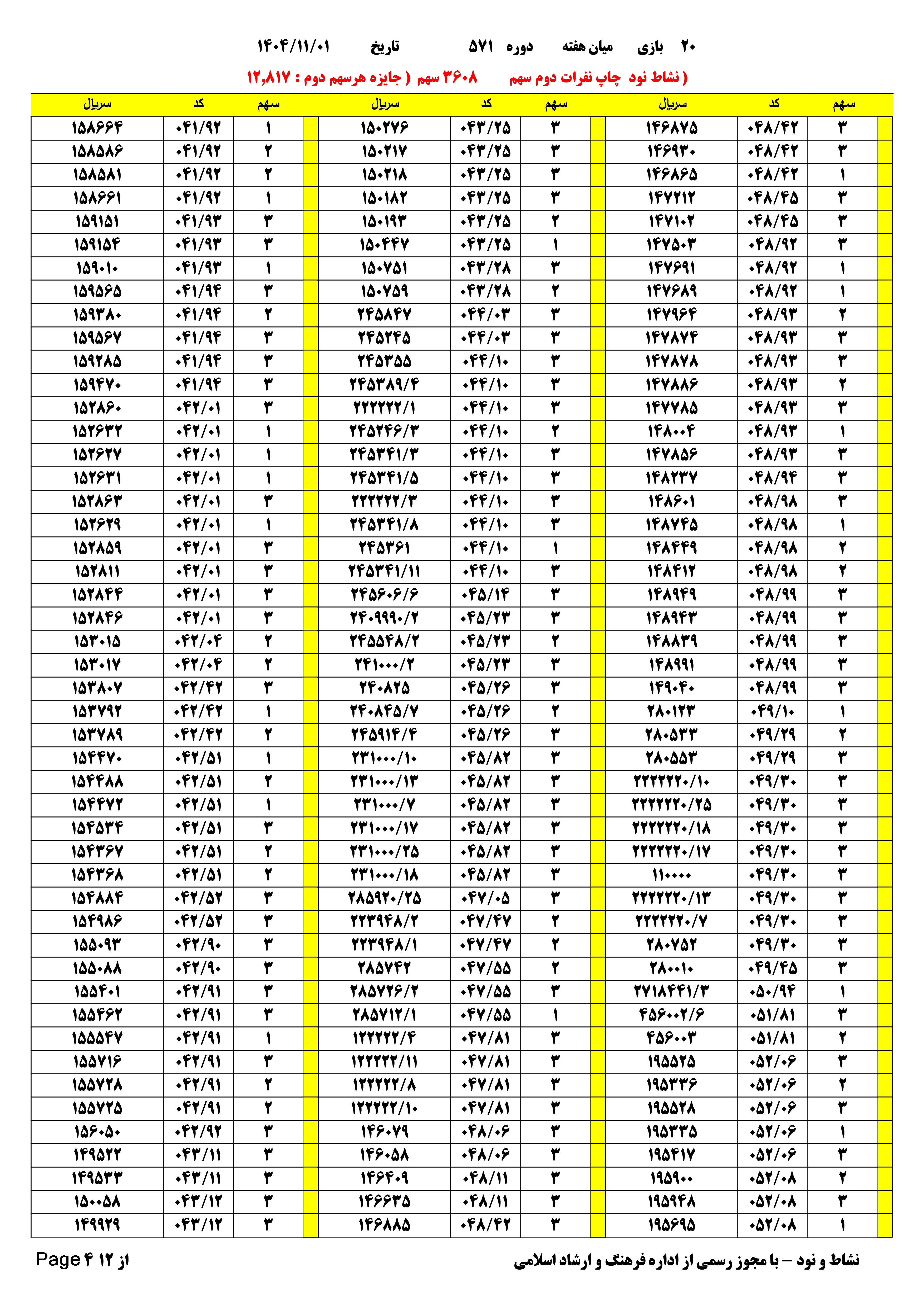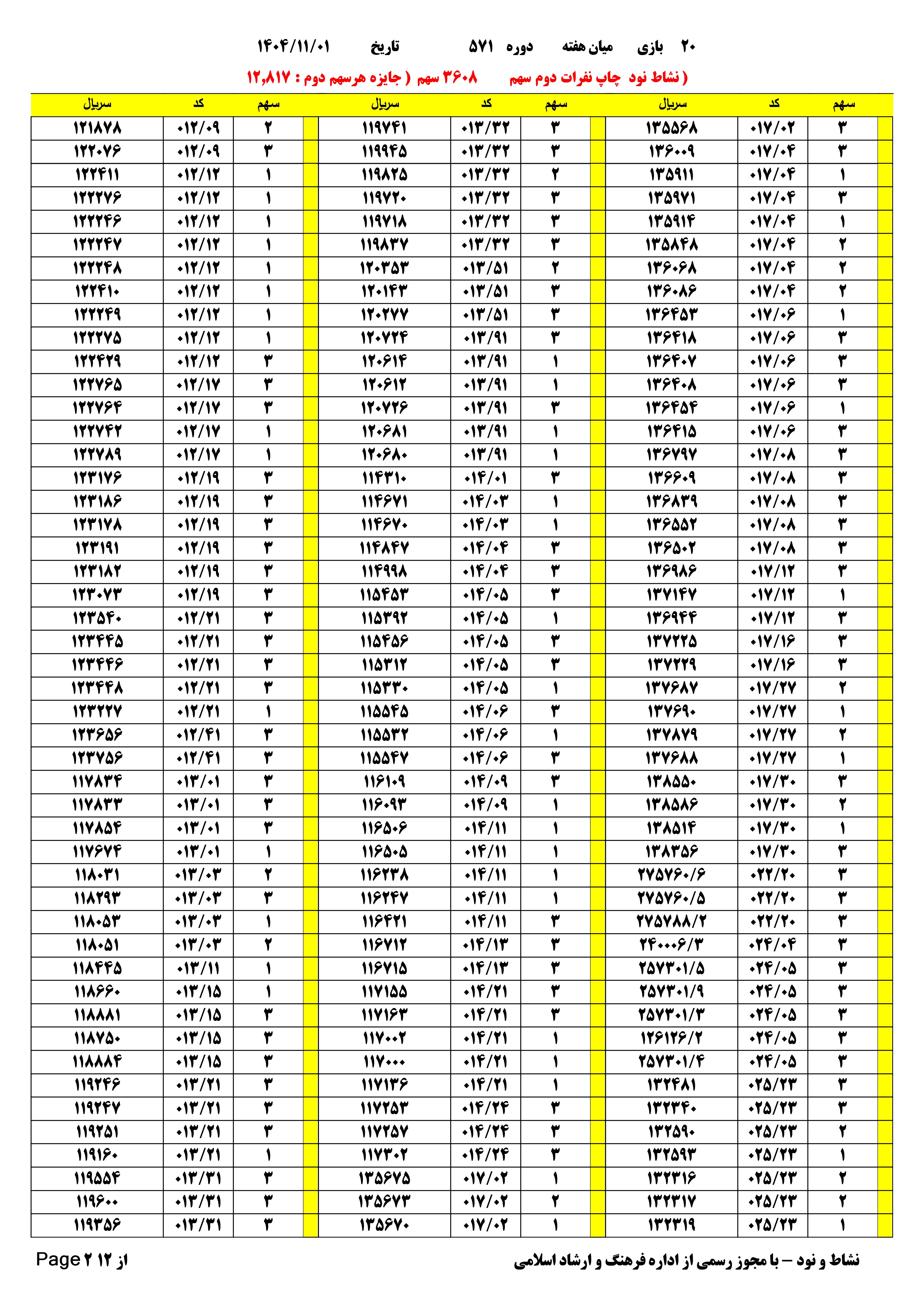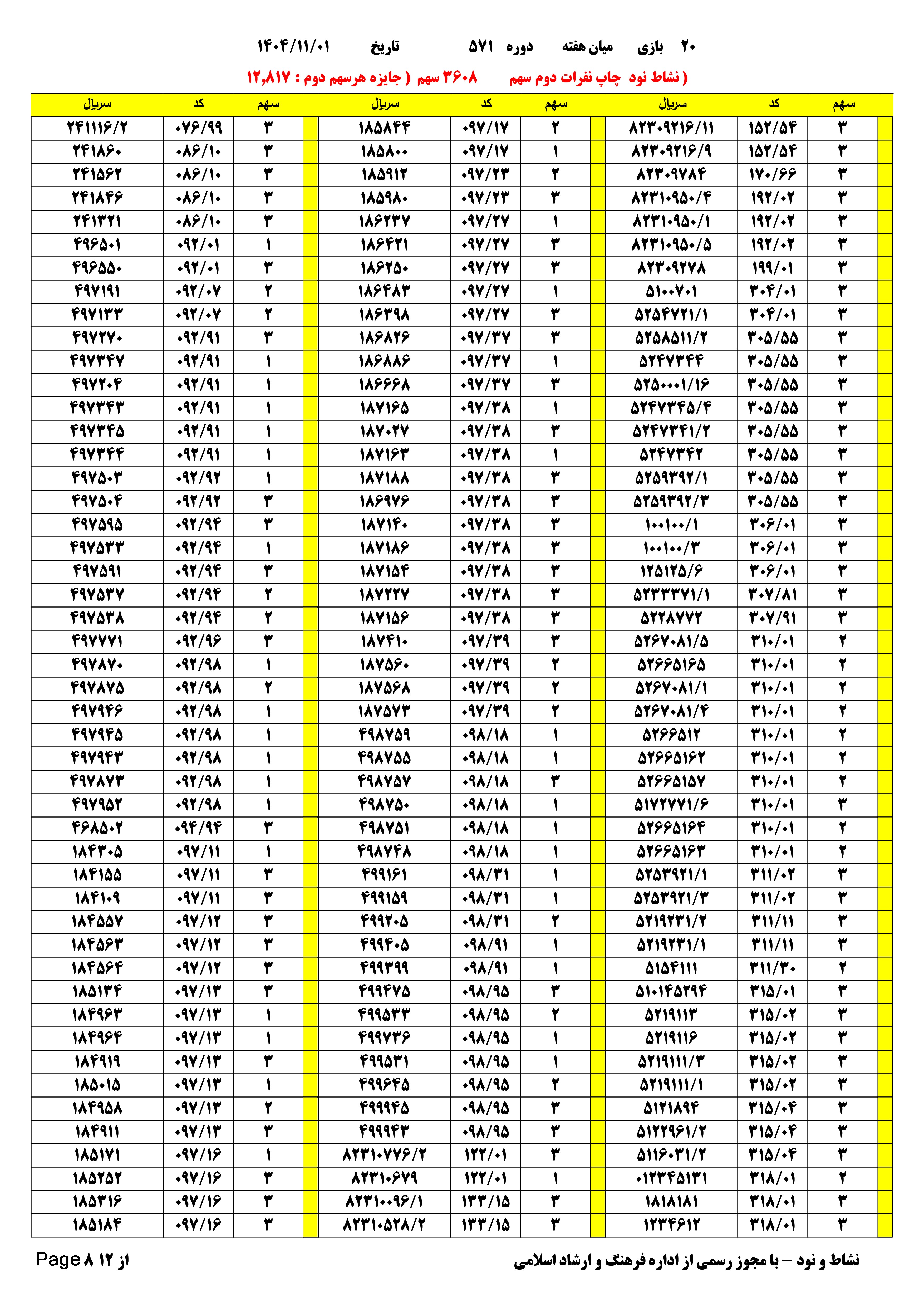 تعدادبرگه های یک خطا 1590 فرم 3608 سهم مبلغ.هدیه.نفرات.دوم هر سهم 12.817